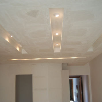 O uso do gesso na arquitetura de interiores poderá ter até duas funções, a decorativa com molduras, frisos, florões, sancas, cimalhas, iluminação embutida, revestimentos de colunas, frentes de lareira , captéis, além de perfis e bordas de janelas e portas e rebaixamento de teto, aí não só pela sua função estética, mas também, muitas vezes, pela necessidade de se esconder uma tubulação hidro sanitária aparente no teto.